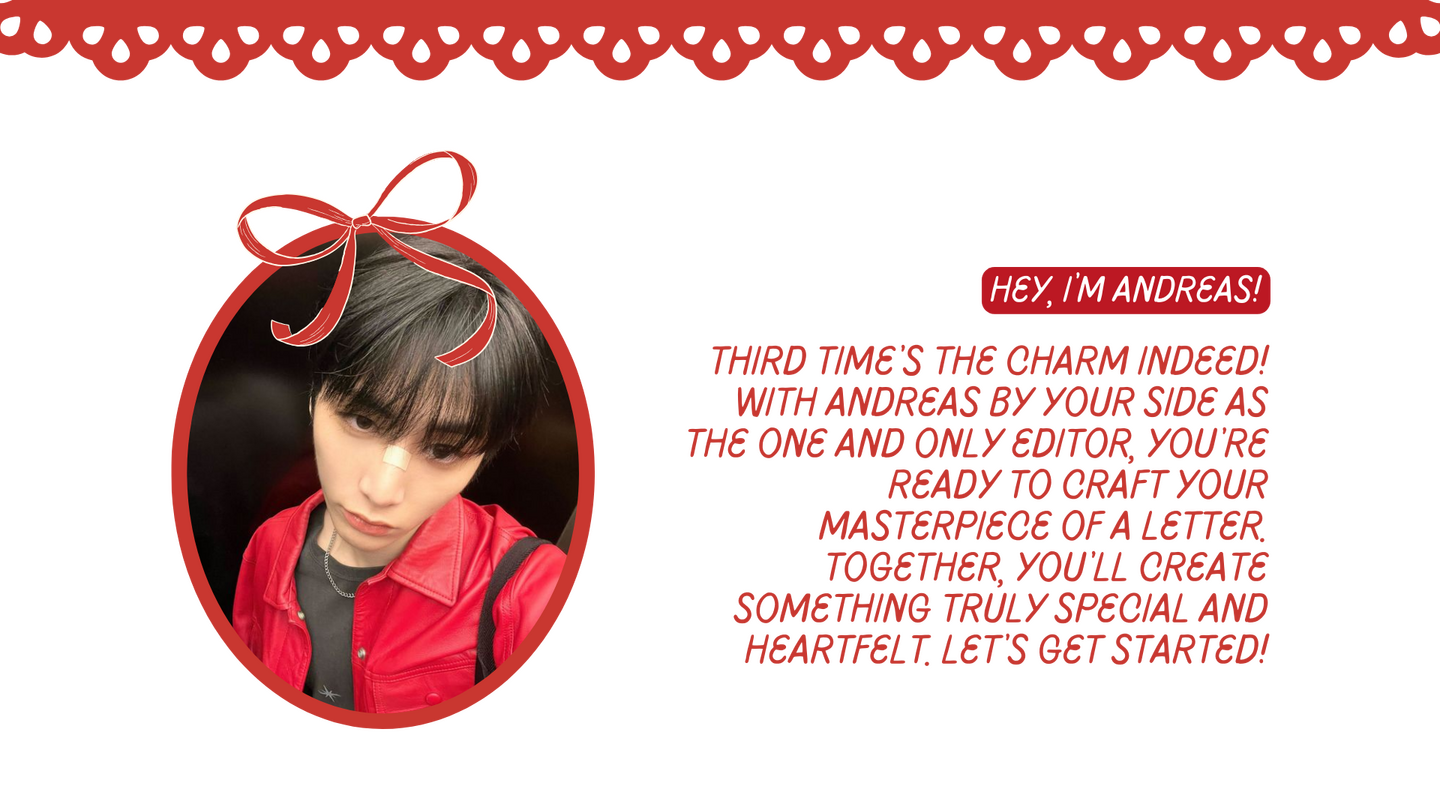 Third time's the charm indeed! With Andreas by your side as the one and only editor, you're ready to craft your masterpiece of a letter. Together, you'll create something truly special and heartfelt. Let's get started!